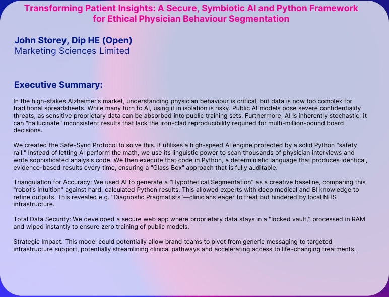 John used the complex Alzheimer’s therapy area as a test development case, to see how Physicians segment on prescription preferences of the new and upcoming Disease Modifying Drugs. He has since also used and tested this for charity and consumer categories.